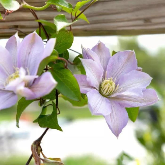 铁线莲其中有一个品种名叫“美好回忆”,是很经典的品种了,其株形能够长到2米以上,攀爬的能力非常强大,分枝的能力也是相当的好,开出的花朵大而华丽,花朵大多为单瓣的,直径能够达到10多厘米,花色呈现为粉白色的,外面还带有一圈紫色的晕边,在阳光下,显得闪闪发光,观赏性特别高。