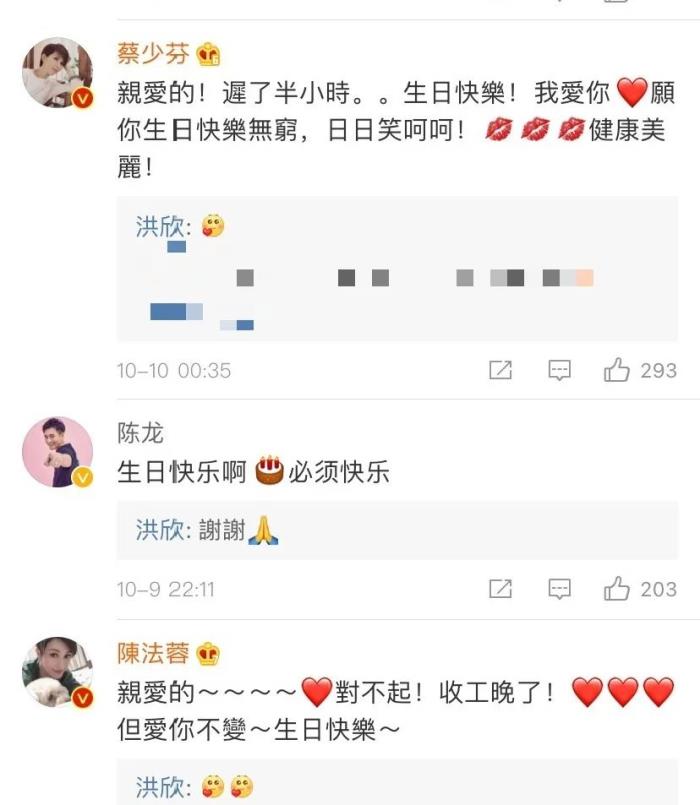微博下面有许多圈中好姐妹和明星的祝福,张丹峰也有评论。洪欣非常有礼貌的一一回复了,唯独没有回复张丹峰的评论。可见洪欣对张丹峰已经到了完全无视的态度。