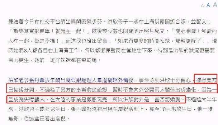 据港媒称,张丹峰和洪欣已经协议分开,但为了张丹峰的事业着想,所以两人暂时不会对外公开。港媒还表示,因为张丹峰一旦成为失德艺人,事业就会玩完,所以洪欣对外一直是否认婚变。