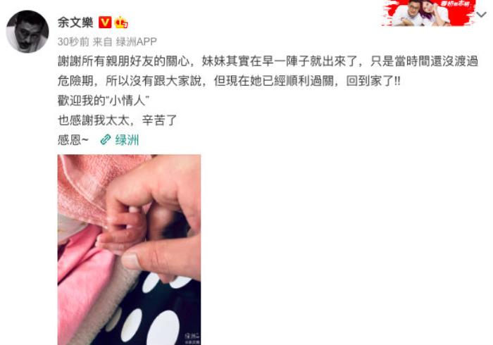 余文乐发文并晒出女儿的小手称:“谢谢亲朋好友的关心,妹妹其实在早一阵子就出来了,只是当时还没渡过危险期,但现在她已经顺利过关,回到家了!欢迎我的小情人,也感謝我太太,辛苦了。”