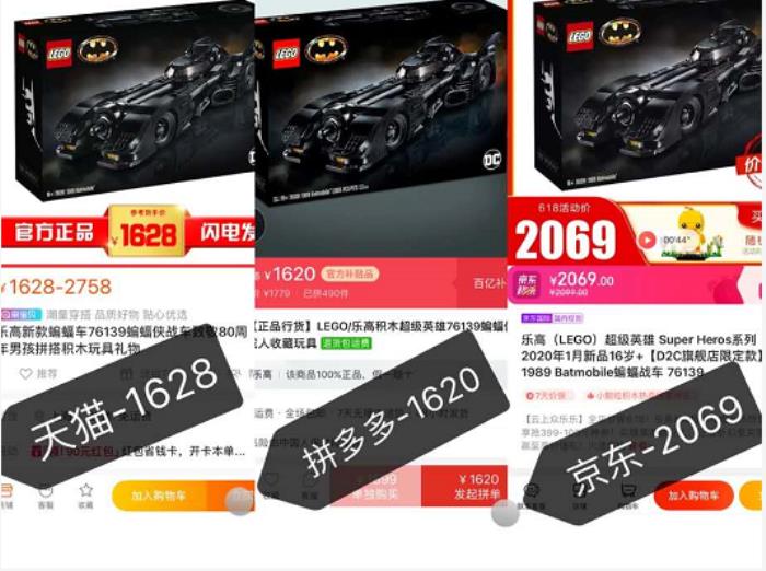 抱着好奇,我又搜了下乐高76139蝙蝠侠战车的价格,京东在售价2069,天猫在售1628,拼多多则是1620。