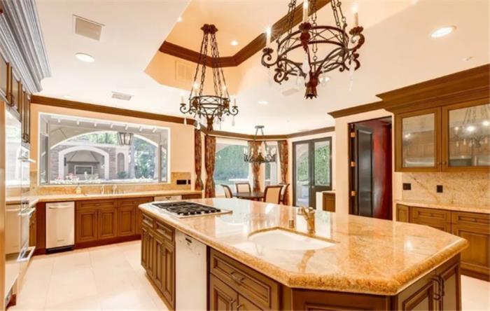 厨房采用了美国传统的开放式设计,中央设计了一个超大的岛台,大理石材质的台面搭配吊灯和宽大的窗扇装饰,更提升了空间内格调,而且厨房还有一扇门直通院子,我们后面再去~