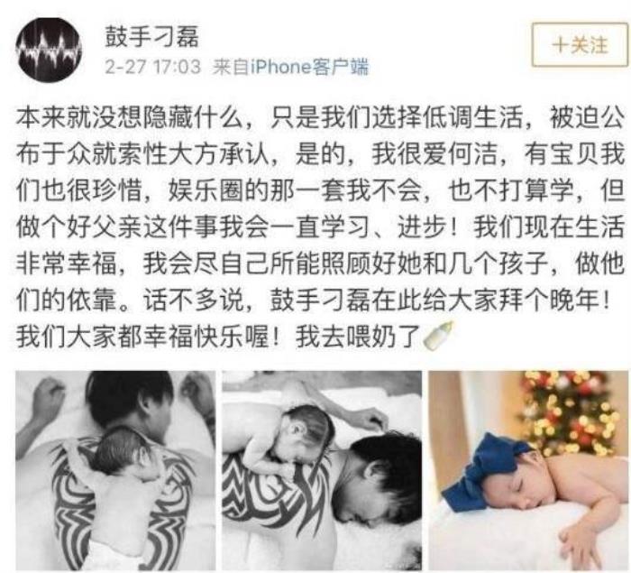 2019年2月27日刁磊首度发文承认何洁诞下第三胎,并首度晒出了一家人的生活照,并在网上公开发文称"本来就没想隐藏什么,只是我们选择低调生活,被迫公布于众就索性大方承认"。