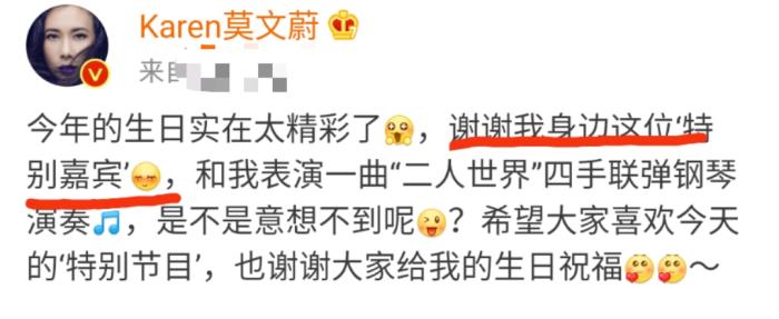 6月2日是莫文蔚的生日,生日当天莫文蔚在社交平台晒出两人一起四手联弹的视频秀恩爱,并且还说到今年的生日太精彩了,"谢谢我身边这位特别嘉宾",配上害羞的小表情简直太甜了。