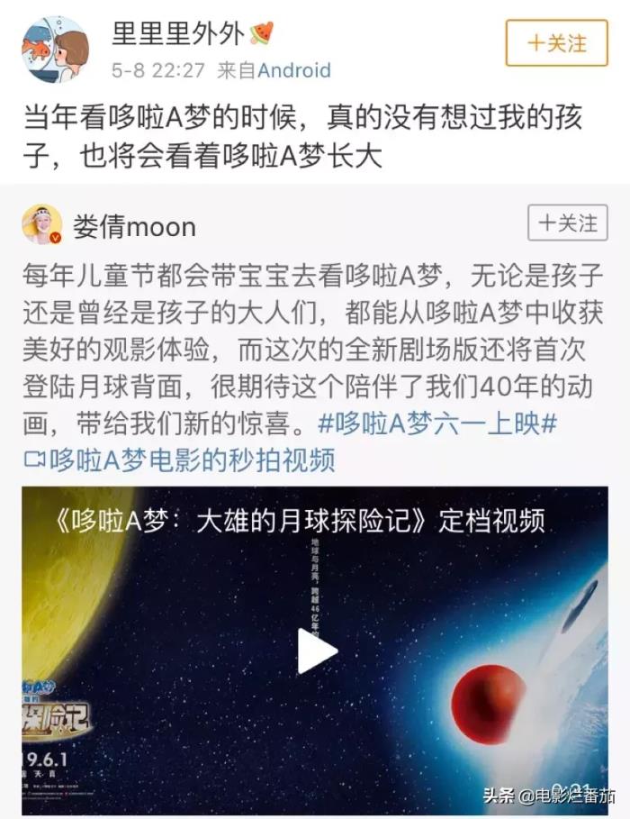也有观众感慨道“当年看哆啦A梦的时候,没想到自己的孩子也会看着哆啦A梦长大”。