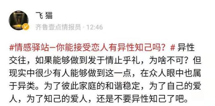 也有壹粉表示爱是排他的,无法接受恋人有异性知己,爱情里没必要冒这个险,也有壹粉愿意为了家庭和谐放弃异性好友。