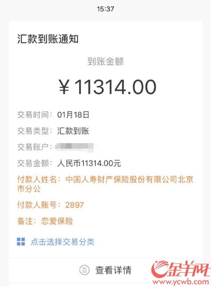 2019年1月,微博网友“拍照的叮叮”发推文,“六年终于修成正果,就这样嫁给你了”,四天后,获得了付款人为“中国人寿财产保险股份有限公司北京分公司”通过银行汇款方式赔付的11314元。他透露,从向保险公司申请理赔到最终获得赔付,总共需要一周左右的时间。