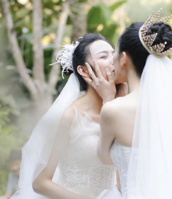原来,杨丽萍的徒弟水月是一位"拉拉",这场婚礼也是公开的同性婚礼,所以两位姑娘都穿了洁白婚纱。