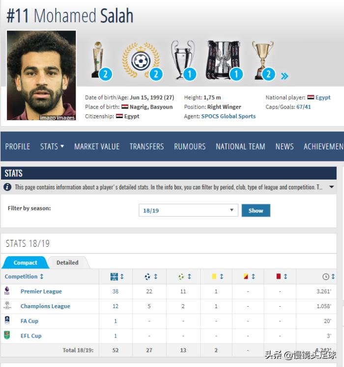 分析点评:同斯特林一样,萨拉赫也有极高的身价,《转会市场》提供的数据显示,萨拉赫目前的身价是1.5亿欧元,比梅西都高。在2019年度,萨拉赫也迎来了丰收的一年,他在这一年帮助利物浦夺取了欧冠冠军、欧洲超级杯冠军和世俱杯的冠军。萨拉赫也有极为出色的个人数据,本赛季出场27次,萨拉赫打入14球。上个赛季,萨拉赫在俱乐部各项赛事出场了52次,打入27球,助攻了13次。在克洛普的麾下,萨拉赫是极为关键的一员,不过他的数据比2017-18赛季有所缩水,当时他在52场比赛可是打入44球,还有16次助攻。数据的下滑,让萨拉赫的排名仅仅是第7位。