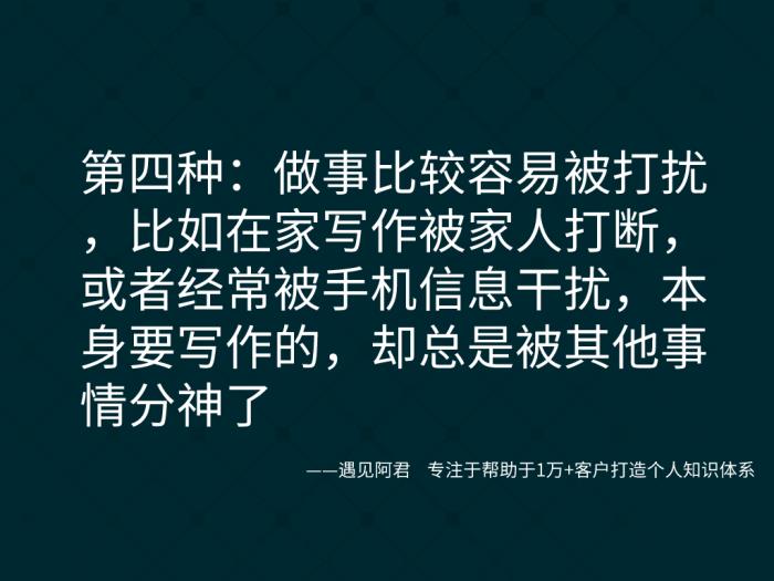 第四种:做事比较容易被打扰,比如在家写作被家人打断,或者经常被手机信息干扰,本身要写作的,却总是被其他事情分神了。