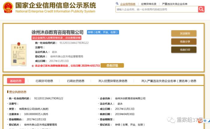 2018年11月13日,沐焱教育公司因通过登记的住所或者经营场所无法联系,被徐州市泉山区市场监督管理局列入经营异常名录。