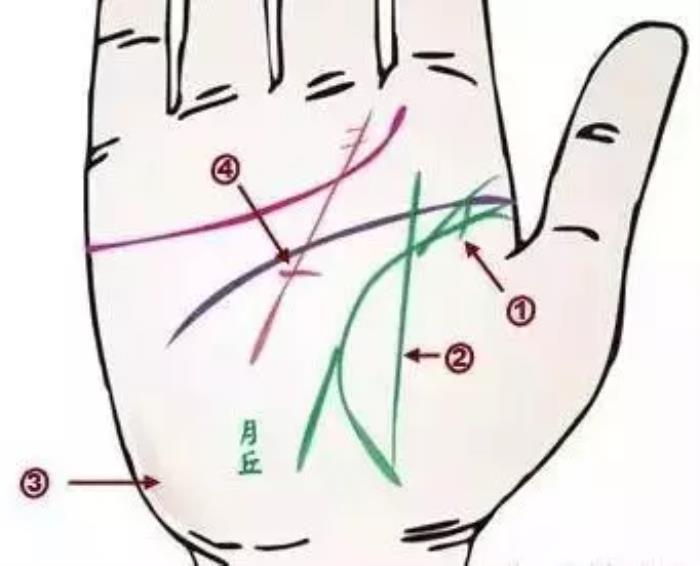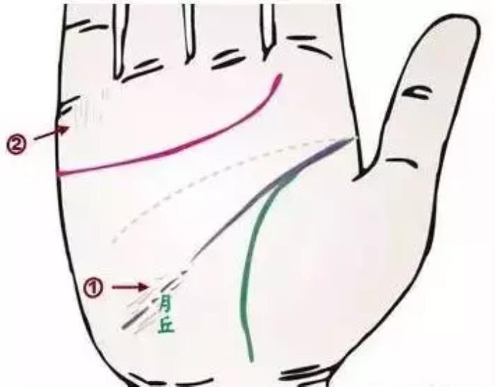 生命线始端分岔,常见于孩童时代脑疾患。有副生命线,这因身体麻痹,多用手动作而起的。中风及脑肿瘤的人也常见。月丘靠手腕处肌肉绷紧隆起,是用手而肌肉发达现象。掌中央十字,表示依托宗教信仰来解病困。
