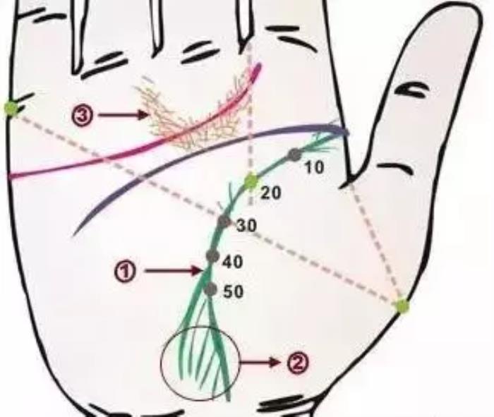 在四十五岁点,生命线分两道下行,表示下半身较弱。由于血行不畅及贫血。天气转寒或入冷气受凉易发下肢痛和腰痛,需善为保护。生命线末端分岔,是未来体力衰退之兆,宜注意日常营养补给,改善贫血。金星带有小纵线丛集,是妇科障碍线,注意节制性生活。