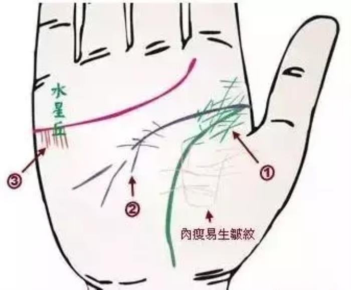 感情线上有许多细短线横切。水星丘胀高,多纵横小纹且模糊不清。此处的感情线通常较薄或有断口。健康线含糊而浅,有岔线。金星丘或月丘发红,有红、紫、茶色斑点。