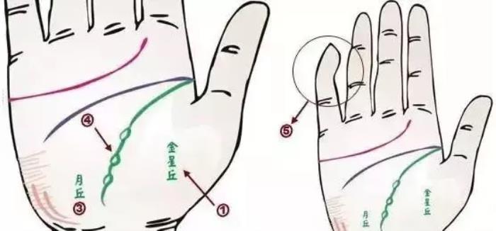 金星丘肉薄而白,易犯癔病。妊娠三个月(没有病),手腕线下一厘米,离外侧一厘米处,有搏动感月丘松垂,血色不润而浊,是性生殖功能低下之兆。生命线有岛,月丘多横线,主子宫弱。尾指弯曲,卵巢功能不全,不易得子。