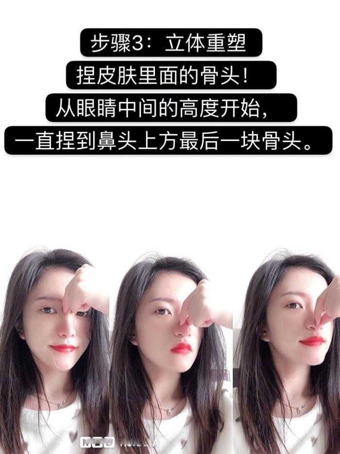 说明:这个手法会让整个鼻梁挺高,并且有类似于开眼角的作用,拉近两眼间距。要知道,山根很重要,再高的鼻梁,要是山根低了,都会显得脸平。