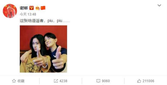 就在今天下午,主持人谢娜发布了这样一条动态,“这张给造谣者,piu,piu……”,配图是她和张碧晨的亲昵合照,两人同时对着镜头做出射击的动作。
