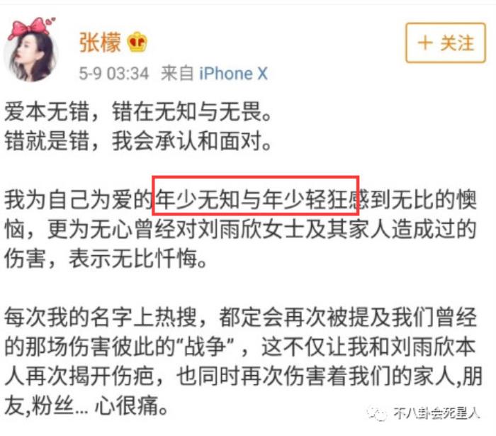 可是在9号的凌晨三点,张檬迅速做出了回应,称自己承认插足刘雨欣和渣男的感情,但只是‘年少无知和年少轻狂’,好清醒的借口啊,88年的张檬,三年前插足人家感情的时候,已经27了,哪来的年少无知?