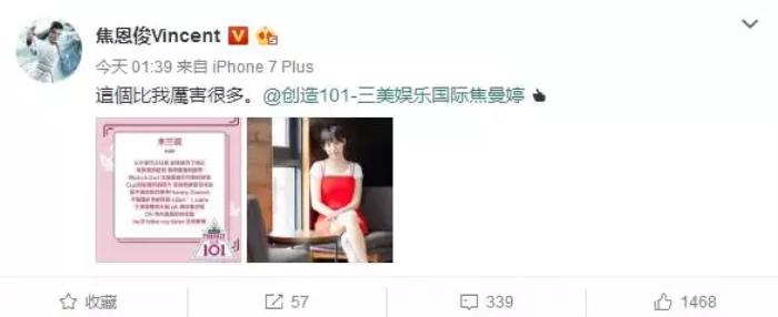 跟《偶像练习生》里的范冰冰弟弟范丞丞相比,焦曼婷顶着星二代光环似乎不怎么明显。