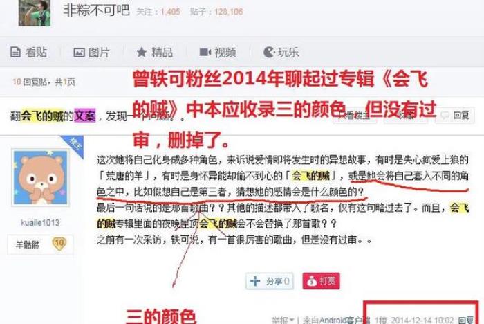 曾轶可的粉丝在2014年就聊起过专辑《会飞的贼》原本会收录《三的颜色》,但因为公司原因所以没有顺利发布。于是,不少粉丝猜测暗示曾轶可抄袭的这位网友,或是因内部关系提前听到了demo,之后将歌词发上网再倒打一靶说曾轶可抄袭。