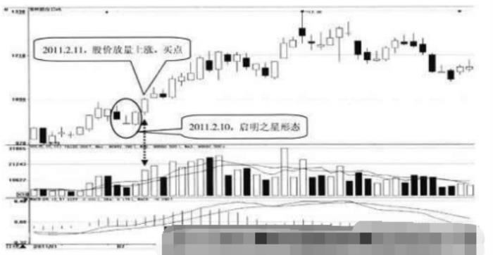 2.启明之星形态出现在下跌走势后期时,一般成交量较低,之后伴随着股价的上涨,成交量将逐步放大。