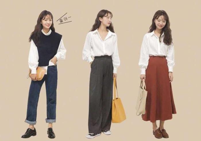 ↑春天的白衬衫,它的搭配更是具有多变性。从左至右,左边是白衬衫和黑色针织背心叠穿,配一条直筒牛仔裤,休闲自在,卷裤边不要忘哦;中间的白衬衫配一条阔腿裤,瞬间变高;右边的白衬衫配复古红优雅半裙,温柔知性小姐姐形象。