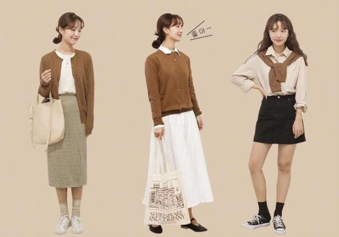 ↑对于可爱的小个子来说,优雅的针织开衫当然不能少啦。咖啡色开衫的3套搭配,从左至右:棕色开衫内搭白色T恤和格子半裙,优雅知性还温柔。中间的棕色开衫内搭白衬衫露出领子,复古放摆的裙摆,再加上发髻,复古时髦调性明显。右边把棕色开衫系在肩头,配一条短裙,休闲又活泼。