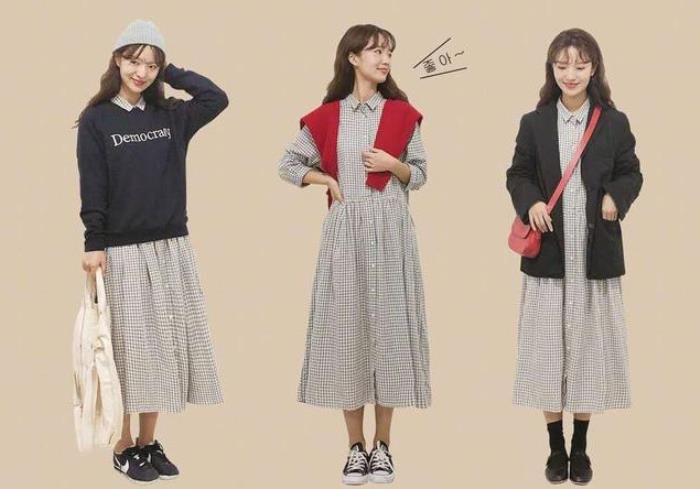 ↑小个子穿长裙,是不错的选择,但长度在小腿中间位置最佳。这条复古格子衬衫裙甜美、清新,很适合偏曲线的小个子。从左至右依次是蓝色卫衣叠穿格子裙、红色毛衣随意搭在肩头叠穿、黑色西服内搭格子裙,3种不同穿法有着明显的风格特点,从休闲到正式,特别值得日常借鉴。