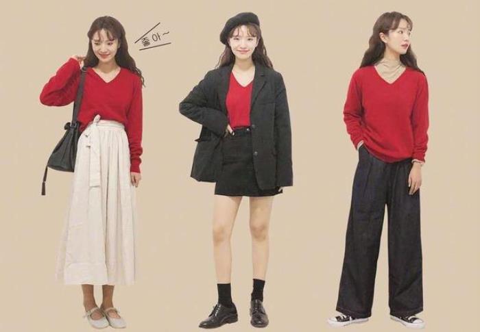 ↑红色V领针织衫,这是春天的款式,轻薄还好看。它的3套不同搭配都非常有特点,裙装的优雅、裤装的利落,短裙的俏皮,都是小个子最喜欢的不同组合。