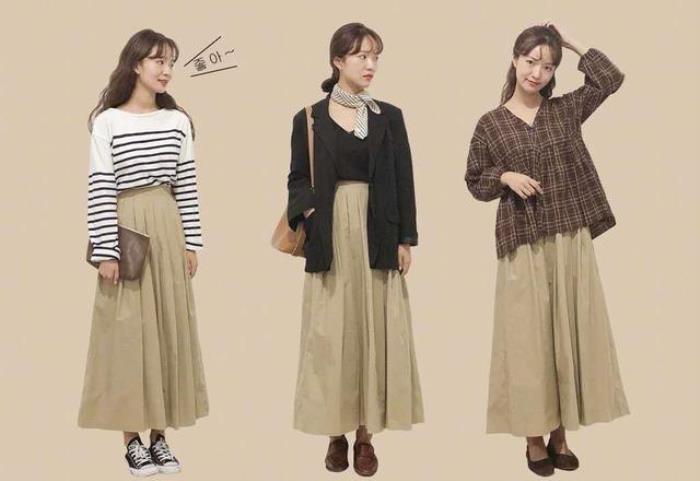 ↑经典、大气的卡其裙,卡其半裙的3套不同风格搭配,左边的休闲,中间的正式,右边的甜美。风格迥异但时髦不变。这类卡其半裙也是衣橱经常见到的单品哦。