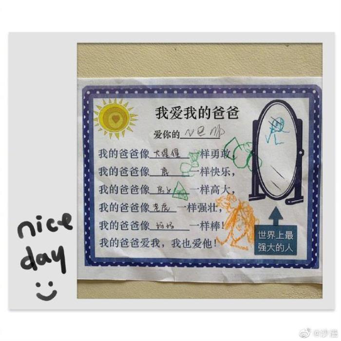 6月13日,沙溢在微博分享儿子小鱼儿的幼儿园作业,在作业中,小鱼儿夸赞沙溢“像妈妈一样棒”。