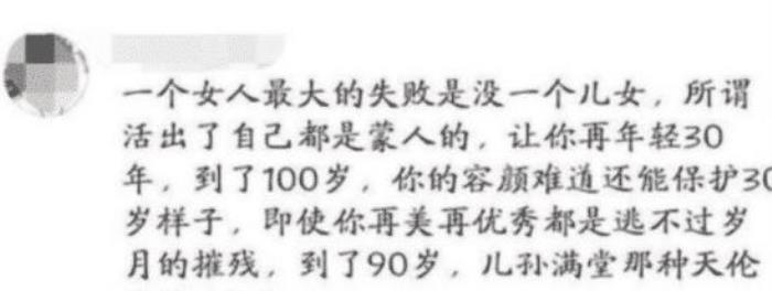 但有网友就在评论区对她进行了抨击,表示说就算保持的再漂亮也是失败的人,因为自己没有后人。对于这位网友的评论,很快引起了大家的热议,不过大多数人都是不同意他的看法,每个人应该有属于自己的活法,不应对别人妄加指责。