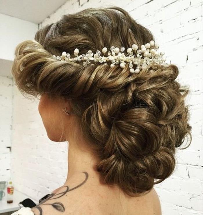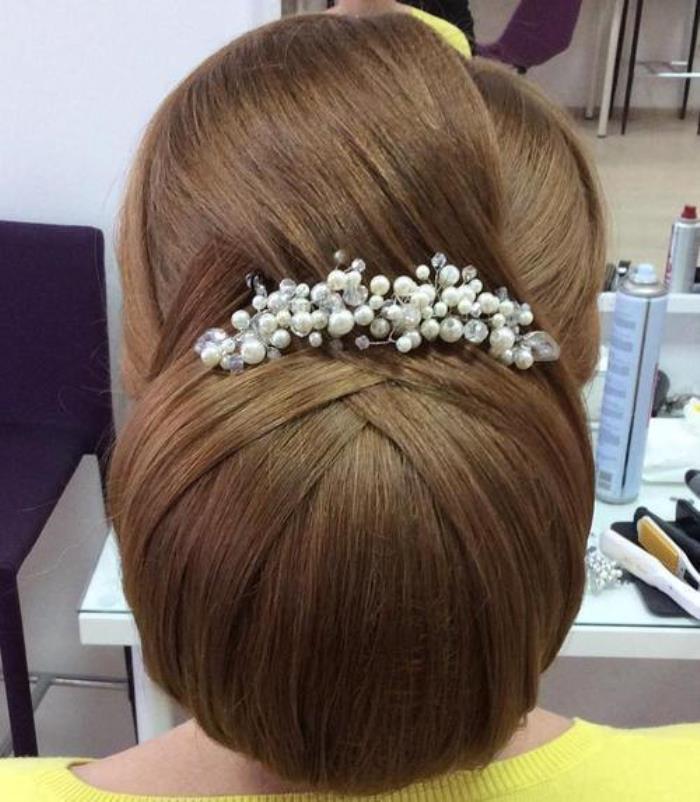 当今的许多婚礼盘发都使用发饰来代替面纱。这种华丽的选择使用珍珠和水晶来突出一个正式场合的螺旋风格。尤其适合头发浓密的女性。