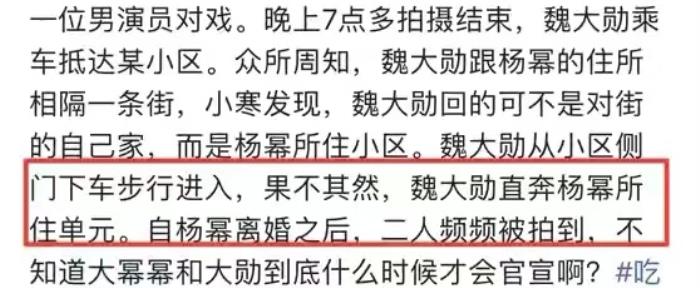 就在几日前,据媒体透露,魏大勋忙碌一天深夜收工后直奔杨幂的住所。两人住处相隔一条街,魏大勋还未进自己家门,就拐弯儿去了杨幂家。但这也只是网传消息,两位当事人并没有回应。