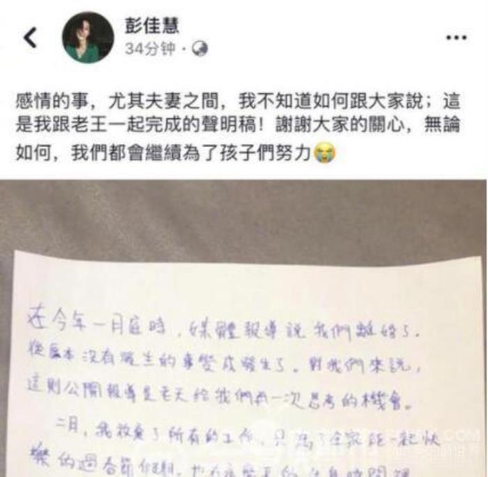 消息爆出后,彭佳慧也在脸书响应写下“感情的事,尤其夫妻之间,我不知道如何跟大家说;这是我跟老王一起完成的声明稿!谢谢大家的关心,无论如何,我们都会继续为了孩子们努力”,同时上传了亲笔信认了12年婚姻结束。