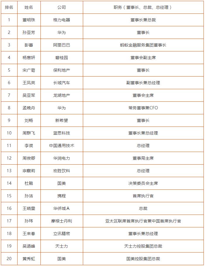 福布斯发布"2017中国最杰出商界女性排行榜",孟晚舟排名第八。