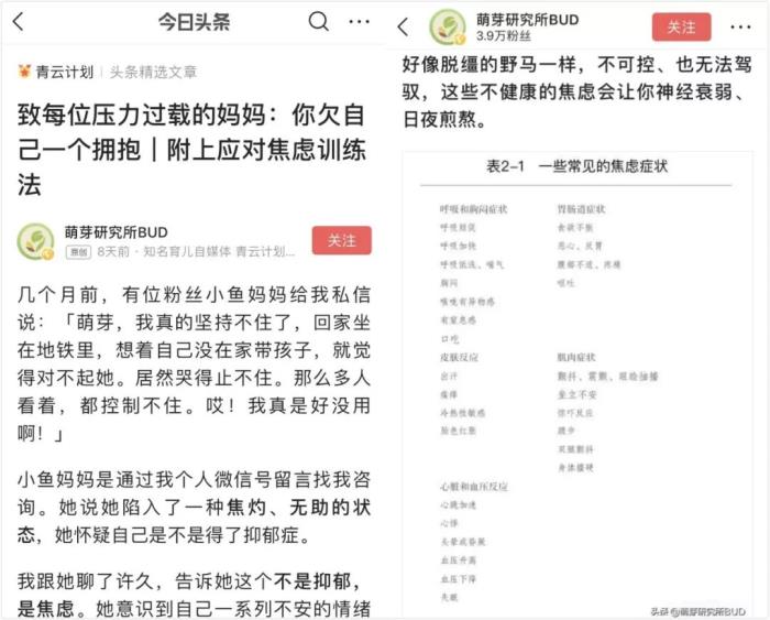 今日头条创作者@萌芽研究所BUD为每位压力过载的妈妈送上心理学“宝典”,教每一位女性用学习用正念训练法、认知训练法、积极想象法将自己从失衡的状态下解放出来。事业和家庭兼顾是“世俗社会成功学”给女性的定义,不必把它们重重地压在自己的翅膀上。