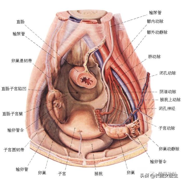 右肾,L2/3椎间盘,腰大肌,第4腰椎(L4),髂嵴,股神经,臀上动/静脉,乙状结肠,子宫动脉,子宫(腔),1髋臼顶(髂骨体),1股骨头,1股骨颈,1大转子,1肛提肌,1髂腰肌,1股外侧肌,1股中间肌,1大收肌,20、腹外斜肌,2腹内斜肌,2腹横肌,2腰动/静脉,2髂腰动/静脉,2髂肌,2髂骨(翼),2直肠上动脉,2髂内动/静脉,2臀中肌,30、臀小肌,3输尿管,3膀胱,3闭孔内肌,3髂股韧带,3髂胫束,3闭孔外肌,3坐骨(支),3会阴深横肌,3小阴唇,40、股薄肌;