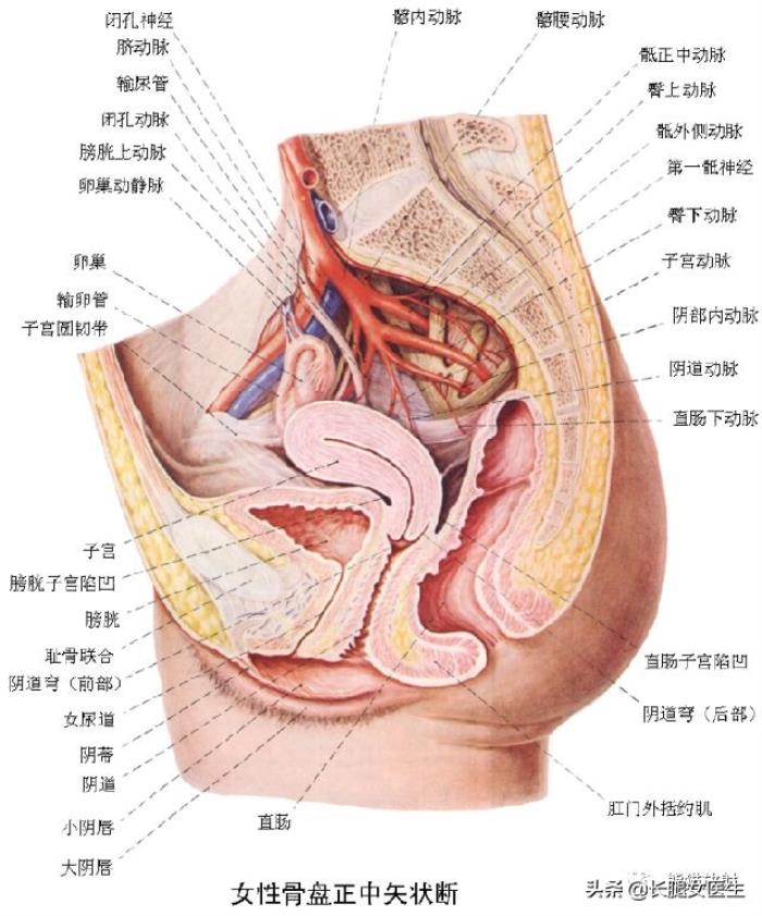 子宫体(肌层),子宫(结合带),子宫(内膜),子宫(宫腔),腹直肌,膀胱子宫陷凹,膀胱,脂肪层(膀胱、尿道与阴道之间),阴道,尿道,1耻骨,1会阴深横肌,1耻骨弓状韧带,1大/小阴唇,1宫颈皱褶,1直肠,1宫颈管,1直肠子宫陷凹(Douglas陷凹),1宫颈口,20、肛尾韧带及提肛肌,2脂肪层(阴道与直肠之间),2肛管及肛门,2会阴体,2肛门外括约肌。