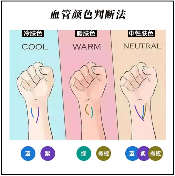 当然,之后大家也可以用流传度最广的血管测试法佐证一下。简单来说就是看你手腕内侧血管的颜色: