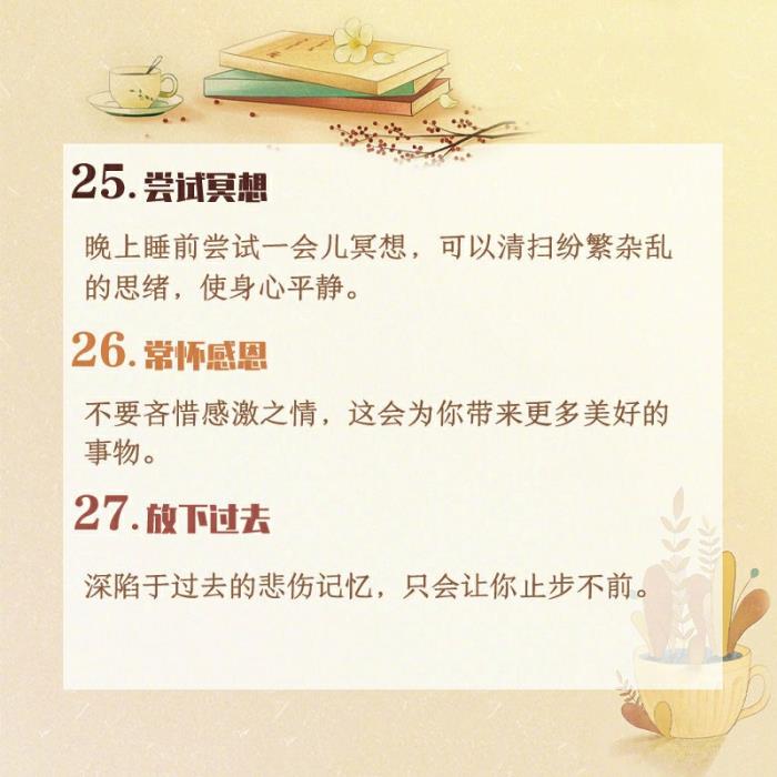 晚上睡前尝试一会儿冥想,可以清扫纷繁杂乱的思绪,使身心平静。