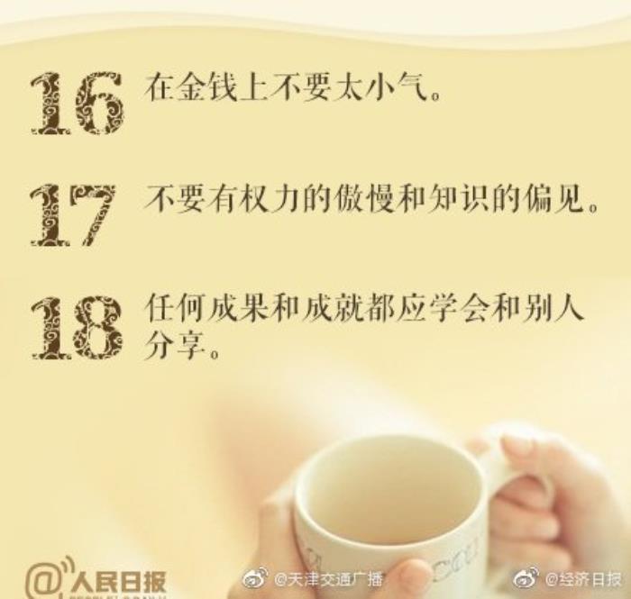 【24个建议提升你的气质】长得耐看和长得好看的差别,很大程度上在于气质。一个人的气质,并不在容颜和身材,而是内在散发的魅力;一个人的修养,不是装扮出来的优雅,而是一段人生的沉淀。说话不慌张、对人微笑、遇事温和但有主见……24个建议,生活种种细节的改进,愿岁月雕刻出更好的你。转存!