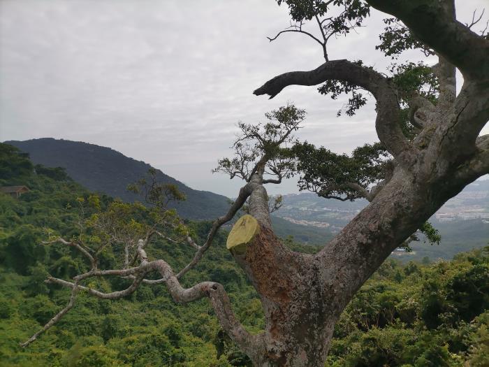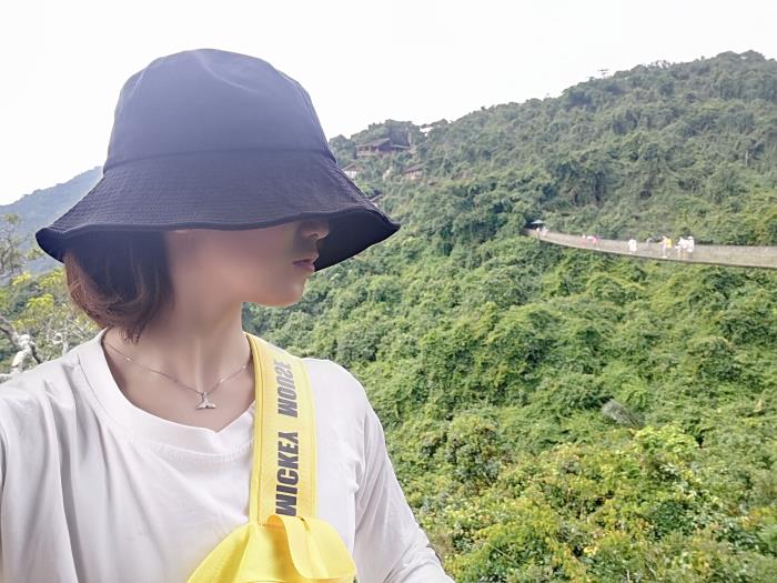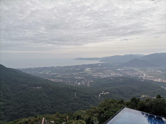 在这里拍了几张照片后便继续往前走了,我们还去了个不起眼的景点——千里伞,是一个有伞形的观景台,这里可以看到试婚房的无边泳池,还能俯瞰亚龙湾海湾,在这里可以换个角度俯瞰亚龙湾海湾的景致。