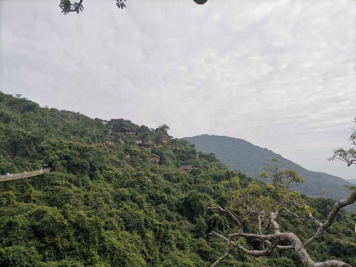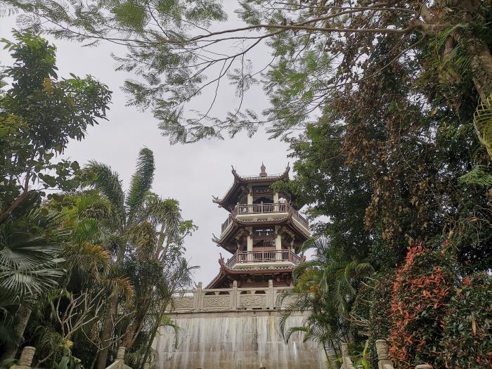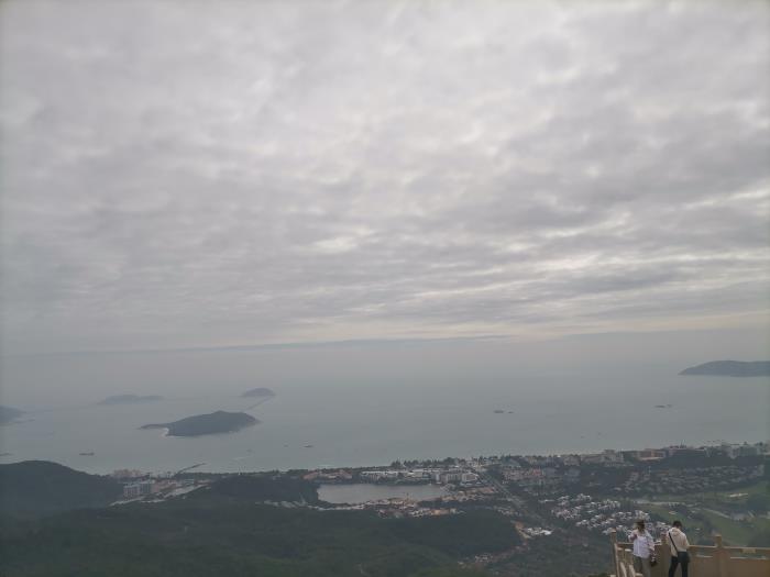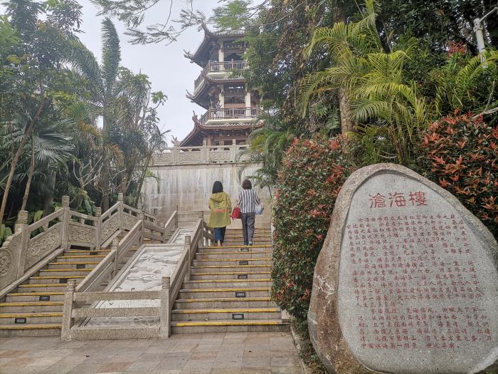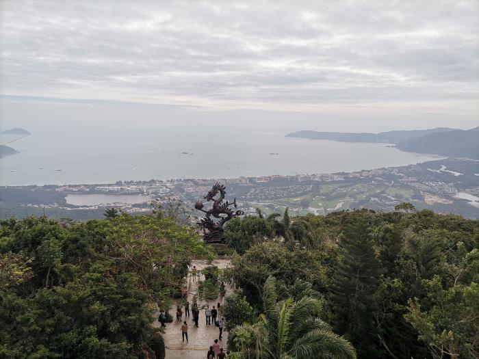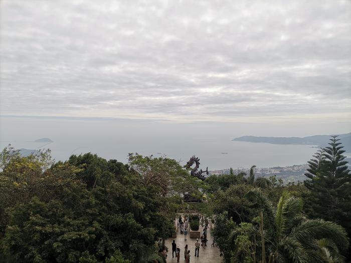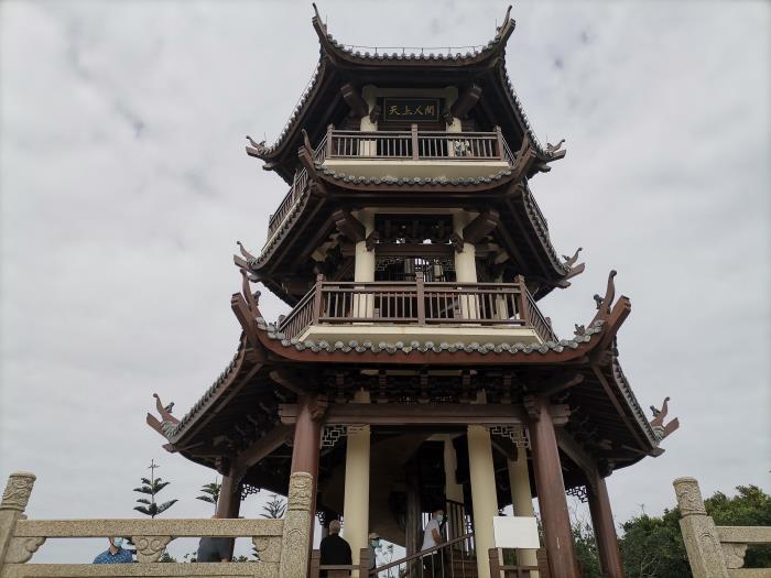 我们穿过一片可举办婚礼的草坪地,有个教堂、圆堡,还有个一见钟情的敲钟,在这里有不少的游客合影拍照,我绕了一圈拍了几张照片便直接到了沧海楼,这个可以俯瞰整个亚龙湾海景的最高处。沧海楼是“南海第一楼”,有“中国最南端楼阁”之称,沧海楼为三层六角攒尖顶木塔式结构,颇有古风古韵的味道。我登上沧海楼,远眺亚龙湾海湾,海景尽收眼底,就是天气不太给力,海天一色都青灰色,如果晴天应该会很美。