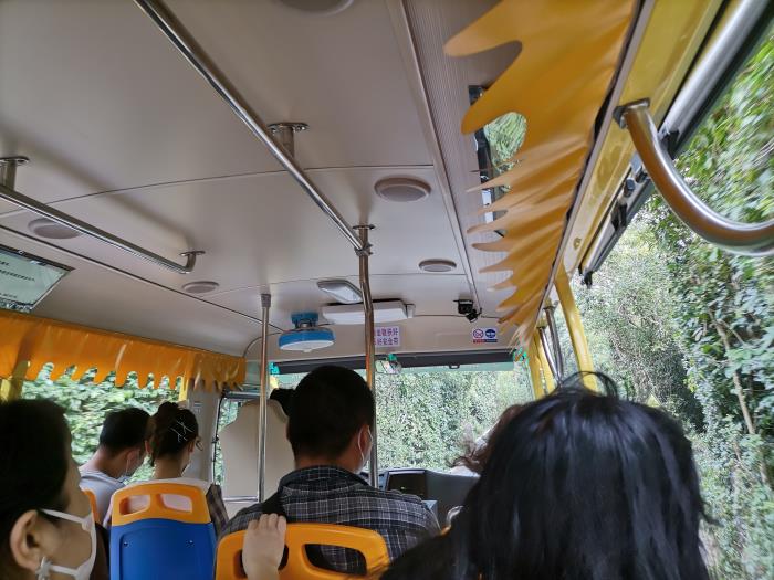 景区里都是山路,所以只能够坐观光车上去,总共三个景点,每到一个景点都会停一下,想在哪儿游览就在哪站下,我直接坐上了山顶——山顶公园,也是玻璃栈道入口处。当时天气有点阴沉,公园里的温度偏低,坐在车上被风吹得有些冷,山路很曲折,山路十八弯的感觉,路面也不宽,只能走两辆观光车,所以每当拐弯的时候迎面碰上下山的观光车时,我都会紧紧抓住车子的栏杆,生怕自己被甩了下去,显然我这种担心有些多余,观光车上每个座位都有安全带,一上车就有工作人员要求你系好安全带然后再出发。