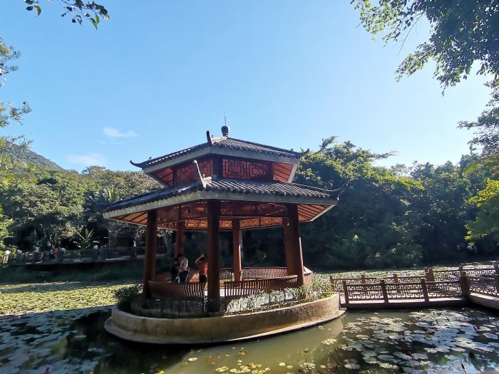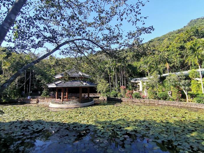 逛完非2取景地便直接下山去下一个景点——兰花谷,以展现原生态的热带雨林特色景观为主,一进景区便能看到名叫飞龙潭的水塘,里面还有盛开着的荷花,还有一个孩童雕像,还有一座供游客休憩的六角亭,我们沿着观光栈道游览,目之所及都是树木风光,走在这里怡然自得。