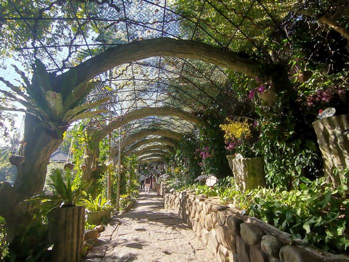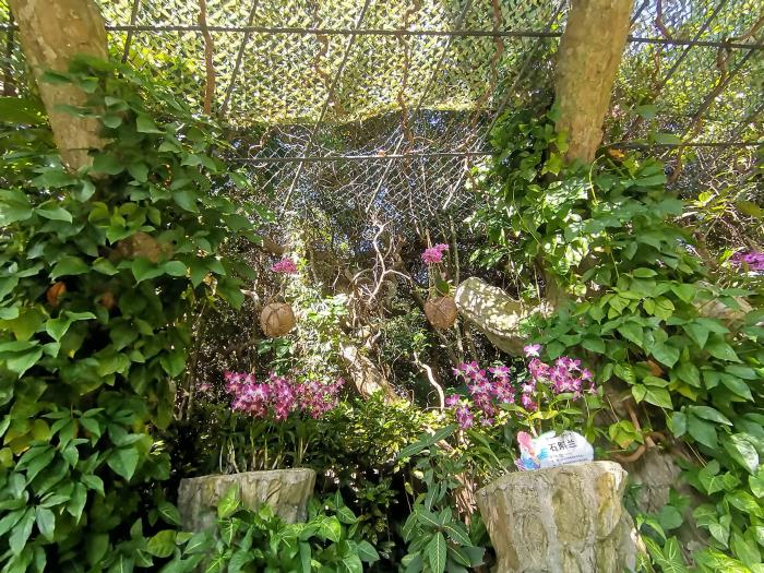 我们沿着栈道往出口走去,忽见一条长达1000多米的回形步道上藤萝密布,溪水潺潺,数十种兰花争奇斗艳、竞相开放,唯美而又浪漫。我们踱步其中,看这花儿开得娇艳,忍不住用手机拍了几张照片。