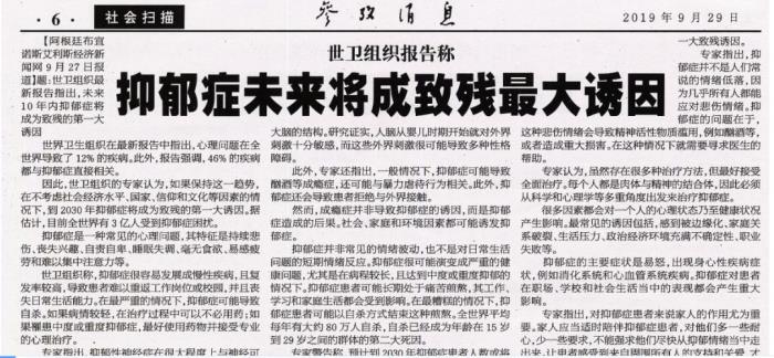 据世界卫生组织报告2019年9月29日指出:抑郁症未来将成致残最大诱因。
