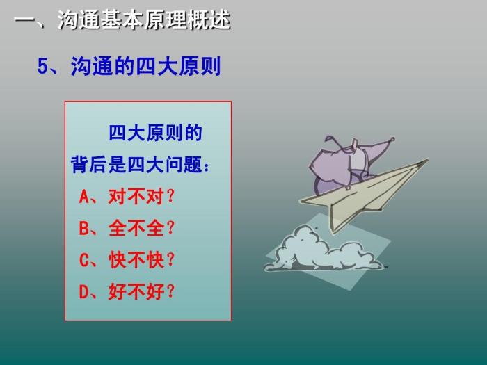 沟通要真诚,尊重适当讲笑活跃谈话气氛讲话又要重点,表达要清晰婉转地表达自己的意见能够敏捷地对别人的言语做出反应等等。这些都是大方向。进一步分解它们,就是能够在实践中运用的“小方法”。