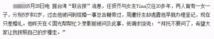 但是任贤齐本人2010年上节目,再次被问到是否结婚,他还是回避问题,拜托周围人不要问了。直到今天,任贤齐都没有回应过这些问题,似乎与老婆还没有领证结婚。